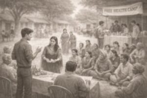 Guide: Choose the young man standing near the table as the hero. Show him taking the lead in organising and supporting a free health camp in the village. Also highlight his confidence, sense of service, and ability to guide people with patience and care. End with a positive and realistic outcome that reflects teamwork and social responsibility.