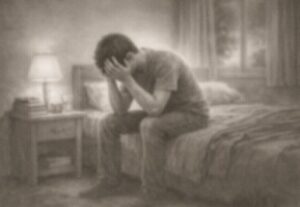 Guide: Choose the boy sitting on the bed as the hero. Show him going through emotional stress due to academic or personal pressure. He realises that keeping it inside is making it worse. Then, he bravely opens up to his parents or a trusted teacher, seeks help, and begins to work on his mental health. End with a hopeful and realistic outcome that shows strength in seeking support.