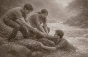Story: Rahul, a 17-year-old schoolboy, was out on a nature trek with his classmates. While crossing a rocky stream, he slipped and fell into the water. The current was strong, and he struggled to hold on. Fear started to build, but he didn’t panic. He called out to his friends. Hearing him, two of his closest friends rushed to help. One held onto a rock while the other reached out to grab Rahul’s arm. It wasn’t easy, but they didn’t give up. Slowly, with teamwork and courage, they pulled Rahul out of the water. He sat on the riverbank, shivering but safe. He looked at his friends and smiled with teary eyes. That day taught him that it’s okay to fall, but what matters is to rise again, especially with people who care. Together, they all walked back stronger than before.